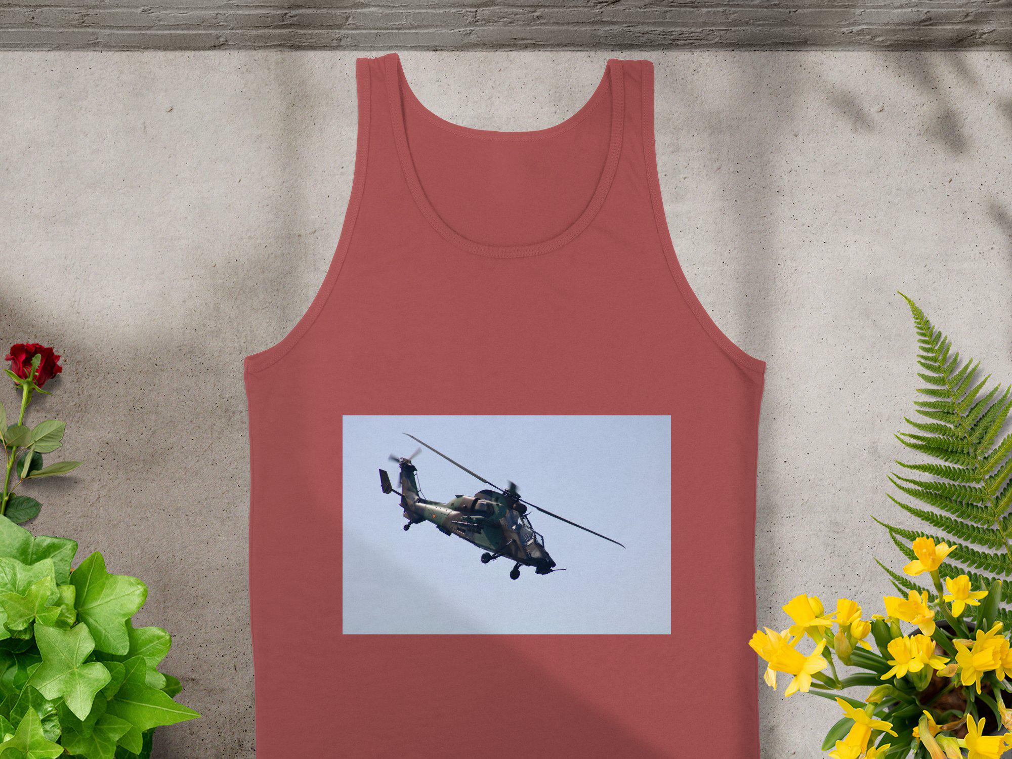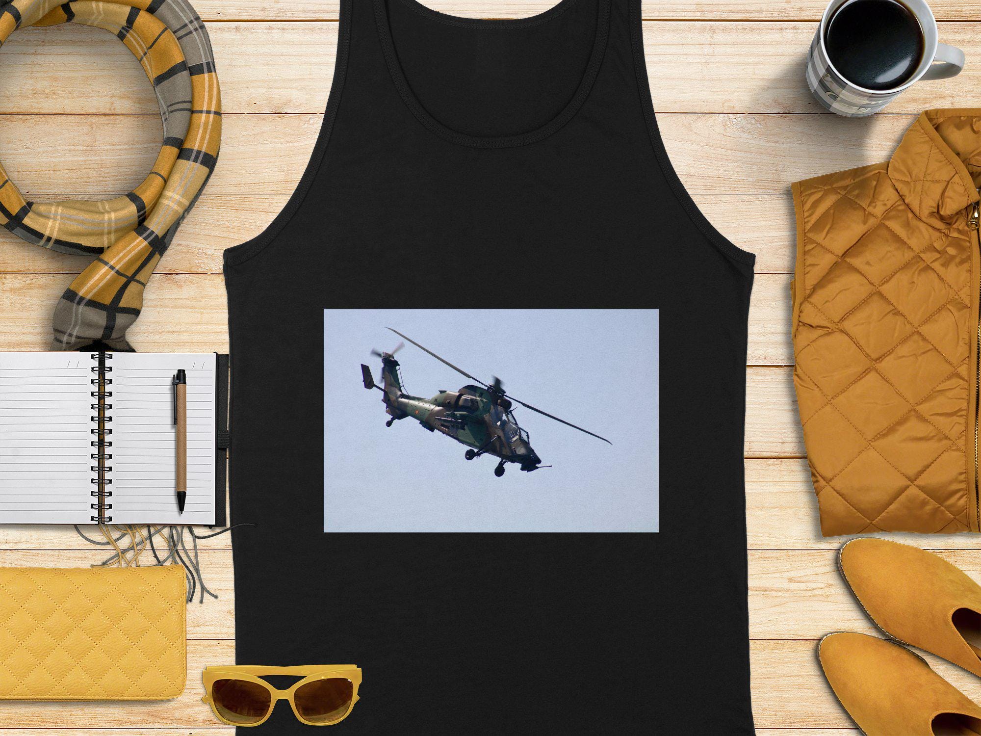 Show off your love for military aviation with this striking tank top featuring a detailed design of an Attack helicopter in action. Perfect for aviation enthusiasts, military personnel, or anyone who appreciates powerful aircrafts. Great for casual wear, gym attire, or as a unique gift for pilots and aviation lovers.
